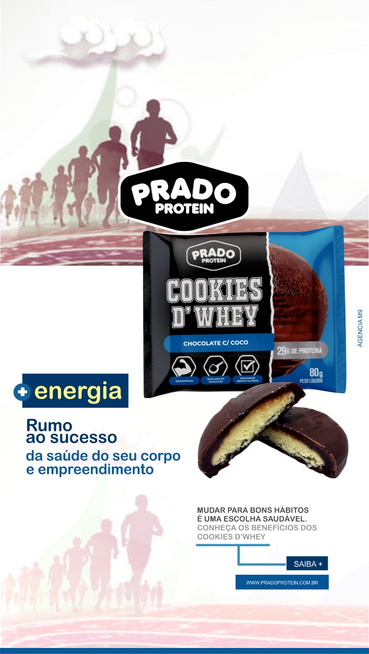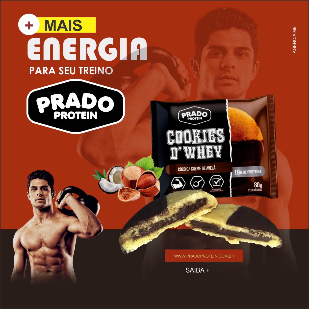 Propaganda ProteÃna Saborosa Cookies d Whey Sabor Chocolate Tradicional Tipo: Propaganda Redes SociaisSegmento: SuplementosCliente: Prado ProteinCores: Marrom e VermelhoTexto na Publicidade: ProteÃna Saborosa