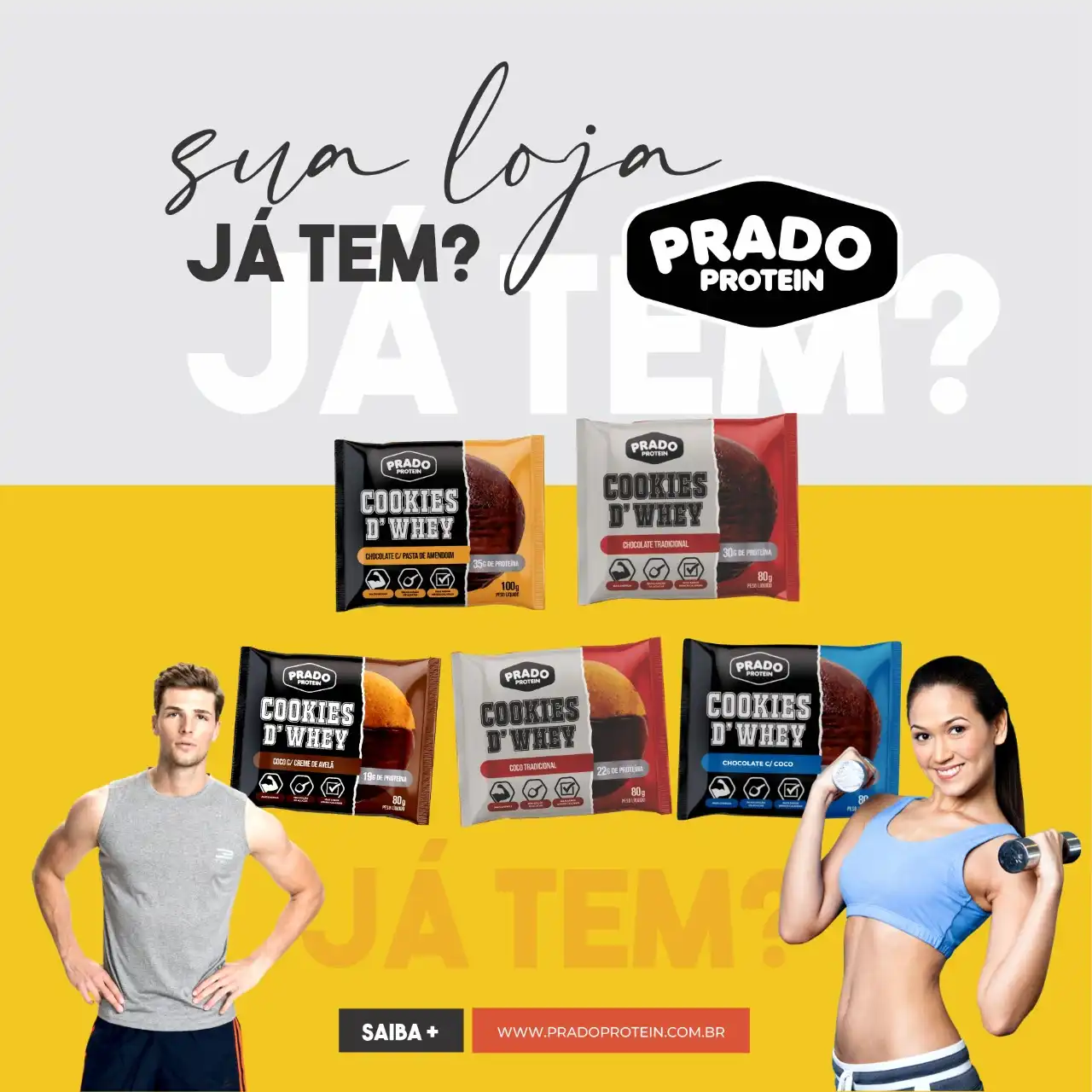 Propaganda Post Cookies de Whey Protein para Lojas de Suplementos Tipo: Propaganda para Rede SocialSegmento: SuplementosCliente: Prado ProteinCores: Amarelo e Cinza Texto na Publicidade: Sua loja ja tem?