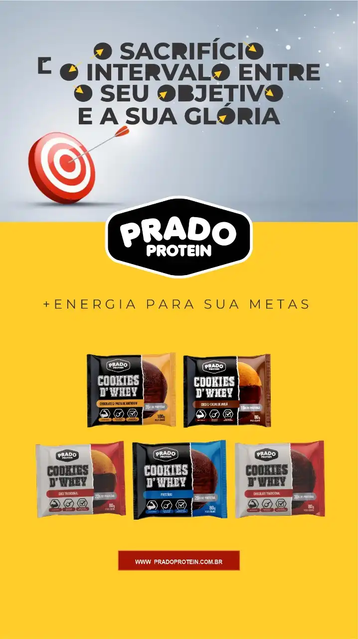 Propaganda Cookie de Whey Protein mais Energia para queimar Caloria Tipo: Propaganda para Rede Social Segmento: Nutrição, Nutricionista, Alimentação, Cookies Cliente: Prado Protein Cores: Amarelo e Marrom Tema: Cookie de Whey Protein mais Energia pra queimar calorias Formato: Feed Instagram e Facebook