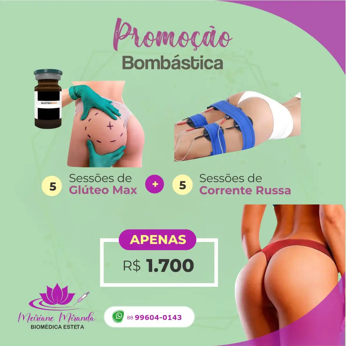 Texto na Publicidade: Promoção Bombástica 5 sessões de glúteo max + 5 sessões de corrente russa APENAS R$1.700,00