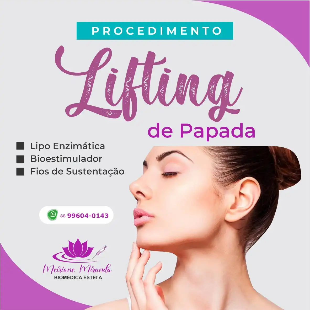 Propaganda Post Lifting de Papada Estética Facial Tipo: Propaganda para Rede SocialCliente: Meiriane Miranda Biomédica EstetaTema: Lifting de papadaCores: Rosa, branco e azulMensagem: Procedimento Lipo EnzimáticaBioestimuladorFios de Sustentação