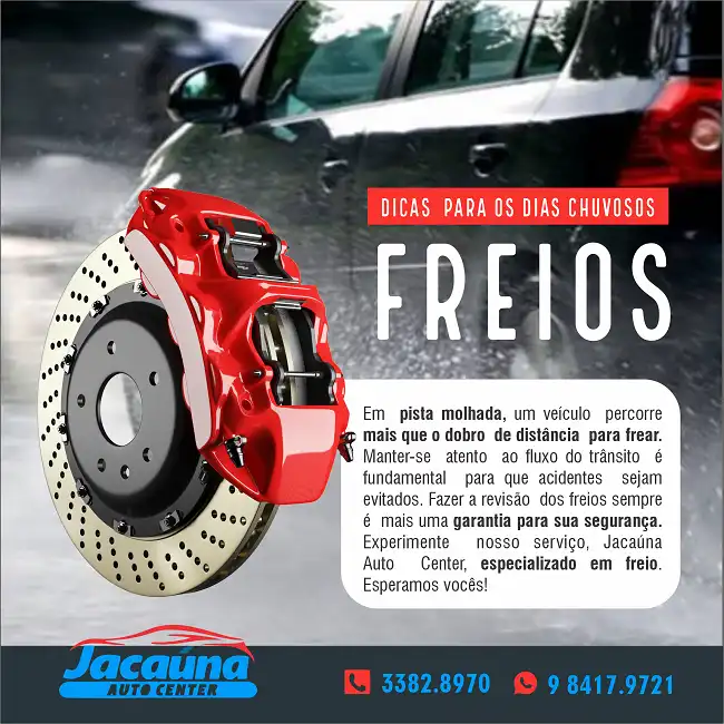 Em pista molhada, um veÃculo percorre mais que o dobro de distância para frear. Manter-se atento ao fluxo do trânsito é fundamental para que acidentes sejam evitados. Fazer a revisão dos freios sempre é mais uma garantia para sua segurança.