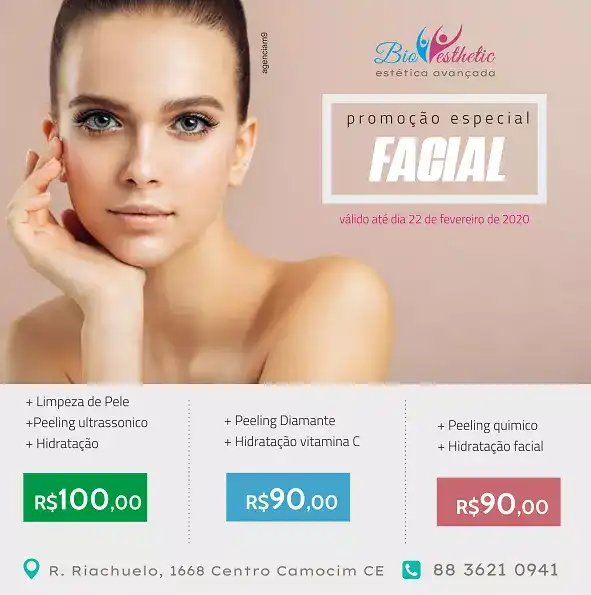 Propaganda Promoção Estética Facial Tipo: Propaganda para InstagramTema: Estética Facial e SaúdeSegmento: Promoção FacialCliente: Bio Esthetic Estética AvançadaCidade: Camocim Estado: CearáCores: Verde, Azul e Rosa Mensagem: Promoção Especial de Estética Facial: Limpeza de Pele, Peeling Ultrasonico, Hidratação, Peeling Diamente, Hidratação Vitamina C, Peeling QuÃmico, Hidratação Facial