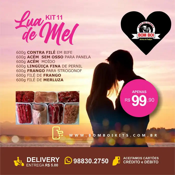 Mensagem: Quite de Carnes de Açougue para Casal. Tema Lua de Mel. Contra Filé em Bife; Acém sem Osso para Panela; Acém MoÃdo; Linguiça Fina de Pernil; Frango para Strogonof; Filé de Frango; Filé de Merluza.
