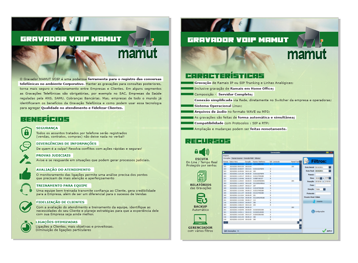 Folheto Técnico para Solução de Empresa de Telecomunicação Tipo: Folheto, Folder, Panfleto Segmento: Tecnologia, Telecomunicação Cores: Tons verdes Cliente: Mamut Tema: Gravador Voip Formato: Vertical, Impresso e Digital Folheto Técnico para Solução de Empresa de Telecomunicação, explicando sobre a tecnologia de Gravação Voio para empresas.