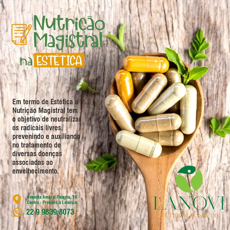 Mensagem: Nutrição Magistral na Estética. Em termos de estética a Nutrição magistral tem o objetivo de neutralizar os radicais livres, prevenindo e auxiliando no tratamento de diversas doenças associadas ao envelhecimento.