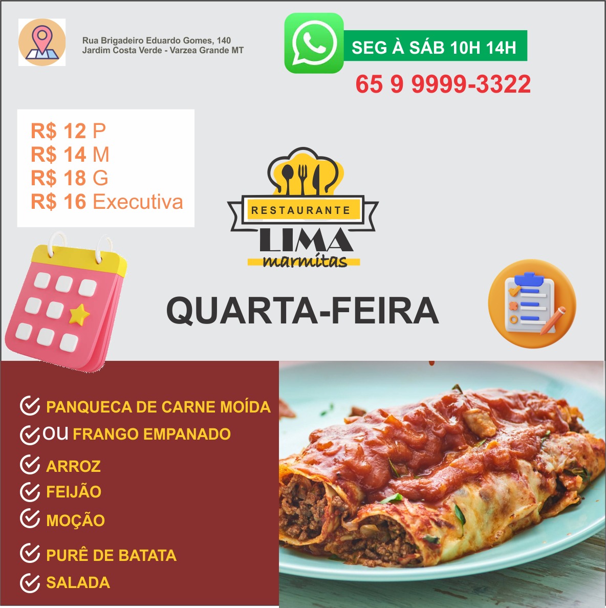 Texto na Publicidade: Panqueca de Carne Moida / ou Frango empanado / arroz / feijão / moção / purê de batata / salada