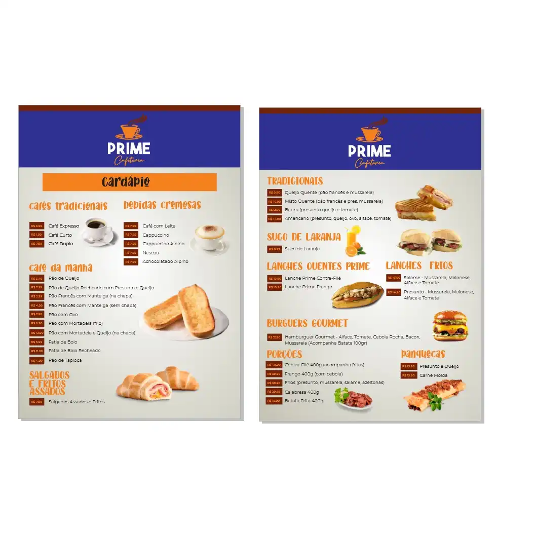 Cardápio para Loja de Conveniência Lanchonete de Posto Tipo: CardápioCliente: Prime cafeteriaTema: CafeteriaCores: Azul, laranja e brancoMensagem: Criação de cardápio para loja de conveniência de posto