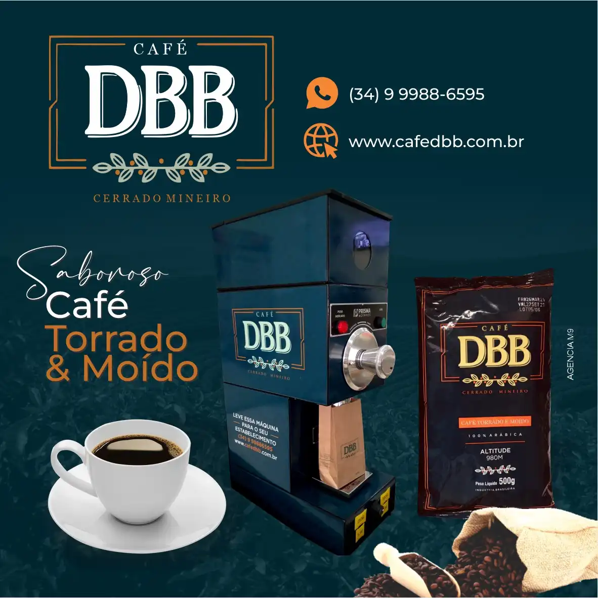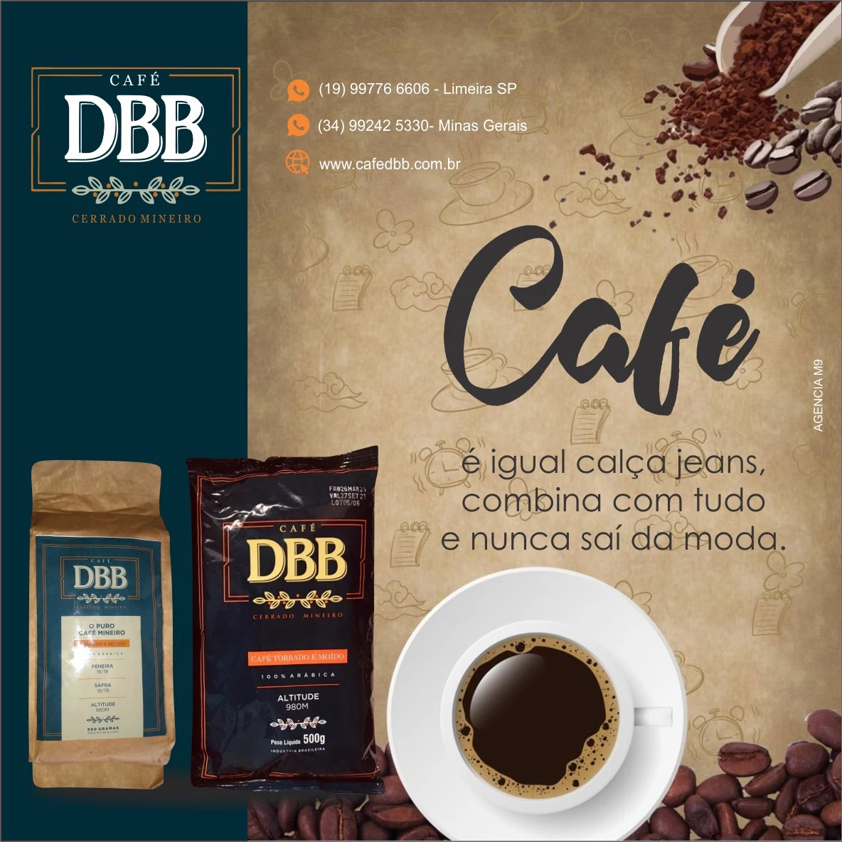 Propaganda Café Torrado e MoÃdo Tipo: Propaganda para Rede Social Segmento: Café Cliente: Café DBBCores: Azul, Laranja e Branco Texto na Publicidade: Café DBB Cerrado Mineiro , Saboroso Café Torrado e MoÃdo