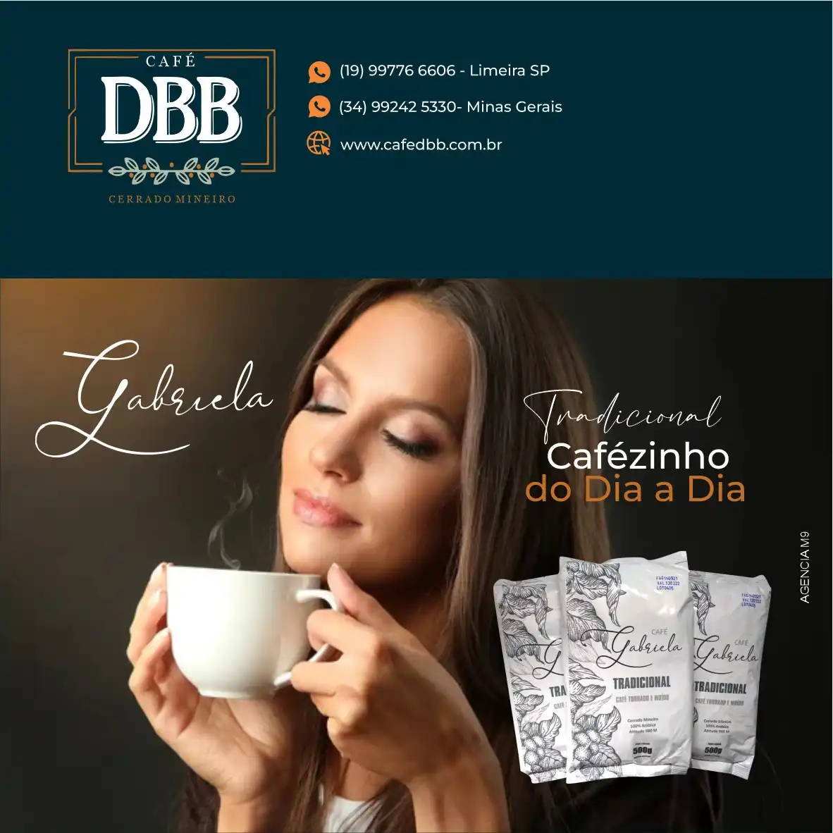 Propaganda Pacote de Café Tradicional Tipo: Propaganda para Rede Social Segmento: CaféCliente: Café DBBCores: Azul e LaranjaTexto na Publicidade: Gabriela – Tradicional cafézinho do dia a dia