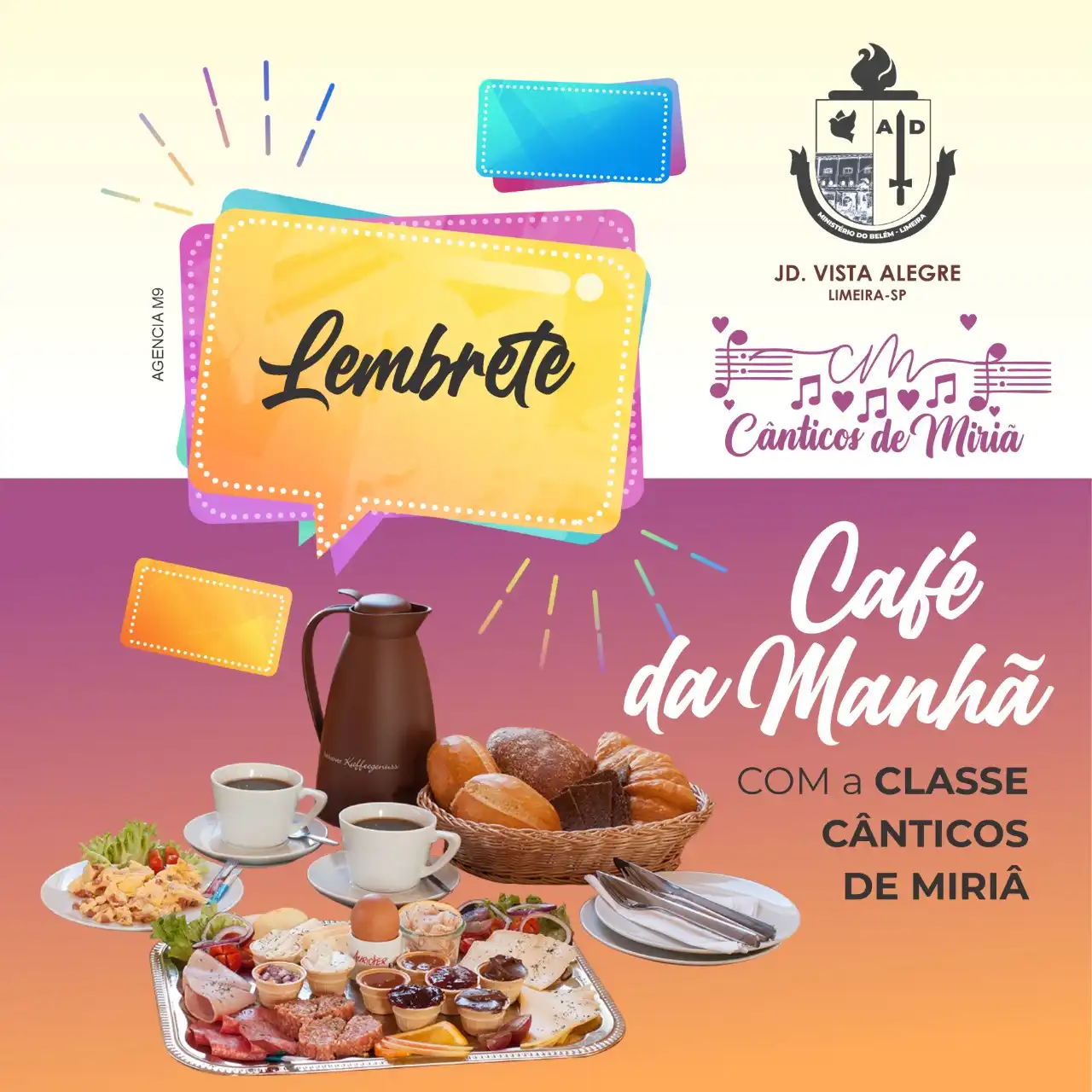 Propaganda Post Café da Manhã Igreja Evangélica Tipo: Propaganda para Rede SocialCliente: A.D. Jd. Vista Alegre – Limeira/SPTema: Café da manhãCores: Azul, rosa e amareloMensagem: Lembrete Café da manhã com a classe cânticos de Miriã