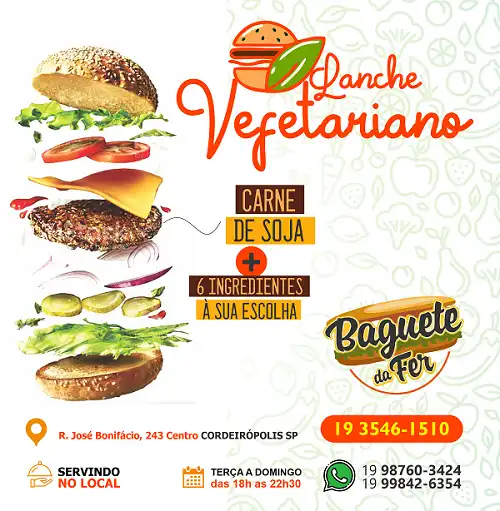 Propaganda Lanche Vegetariano Carne de Soja Tipo: Propaganda para Rede SocialSegmento: Lanchonete, Lanche, Lanches, Delivery, AlimentaçãoCliente: Baguete da FerCores: Verde, Laranja e MarromTema: Propaganda Lanche Vegetariano Carne de Soja Mensagem: Lanche Vegetariano carne de soja mais seis ingredientes à sua escolha.