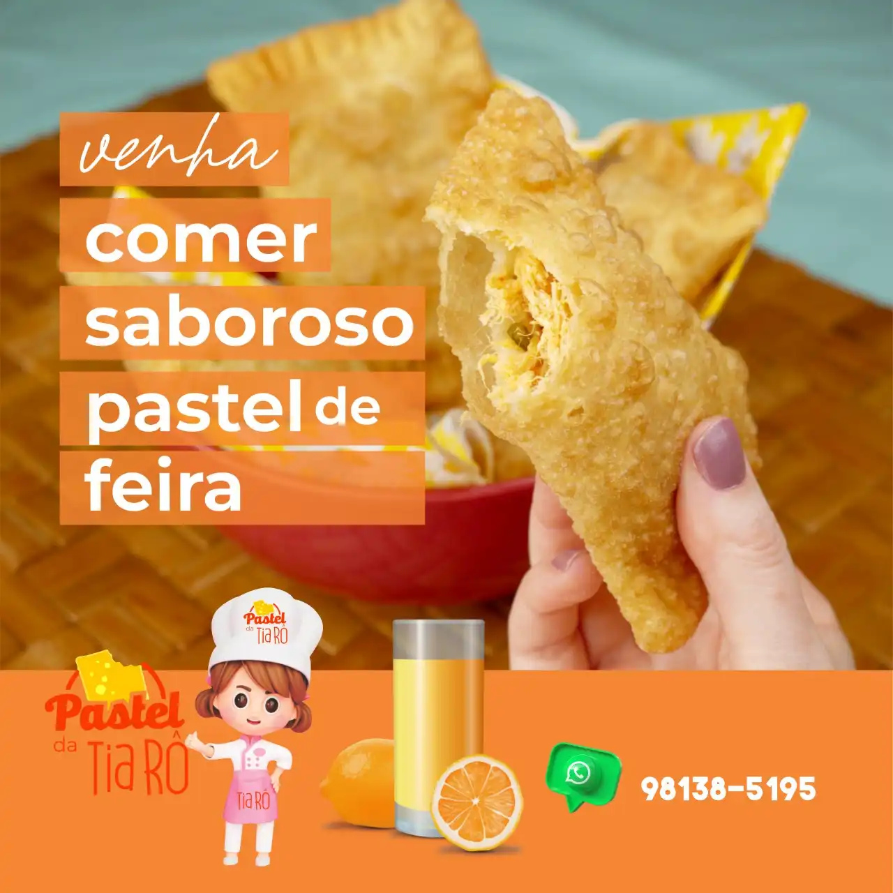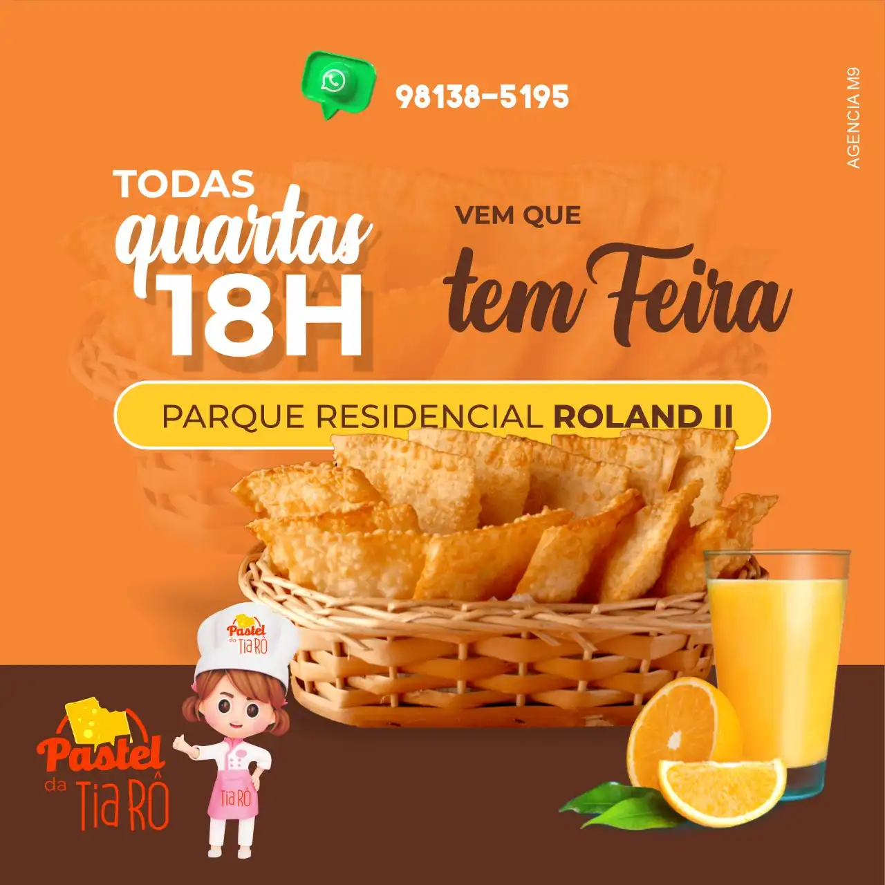 Propaganda Pastel na Feira com Suco Natural de Laranja Tipo: Propaganda para Rede SocialSegmento: PastelCliente: Tia RôCores: LaranjaTexto na Publicidade: Todas quartas 18h vem que tem feira parque residencial roland II