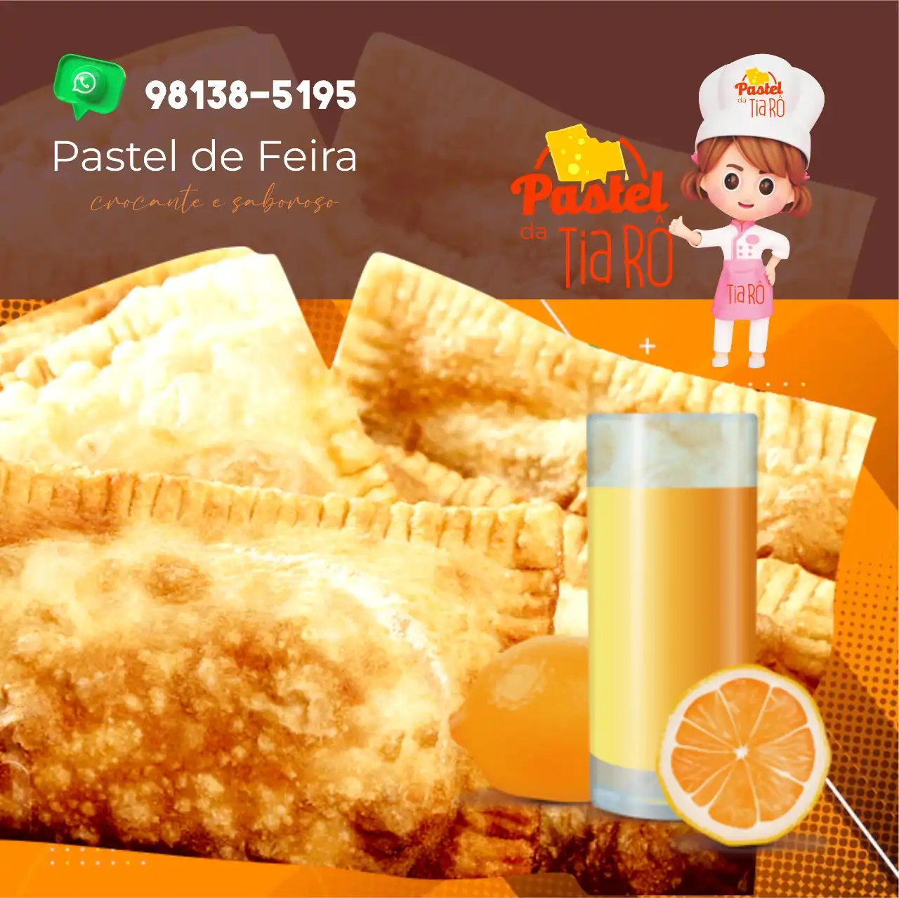 Propaganda Pastel de Feira com Suco Natural de Laranja Tipo: Propaganda para Rede SocialSegmento: Pastel Cliente: Tia Rô Cores: Laranja Texto na Publicidade: Venha comer saboroso pastel de feira