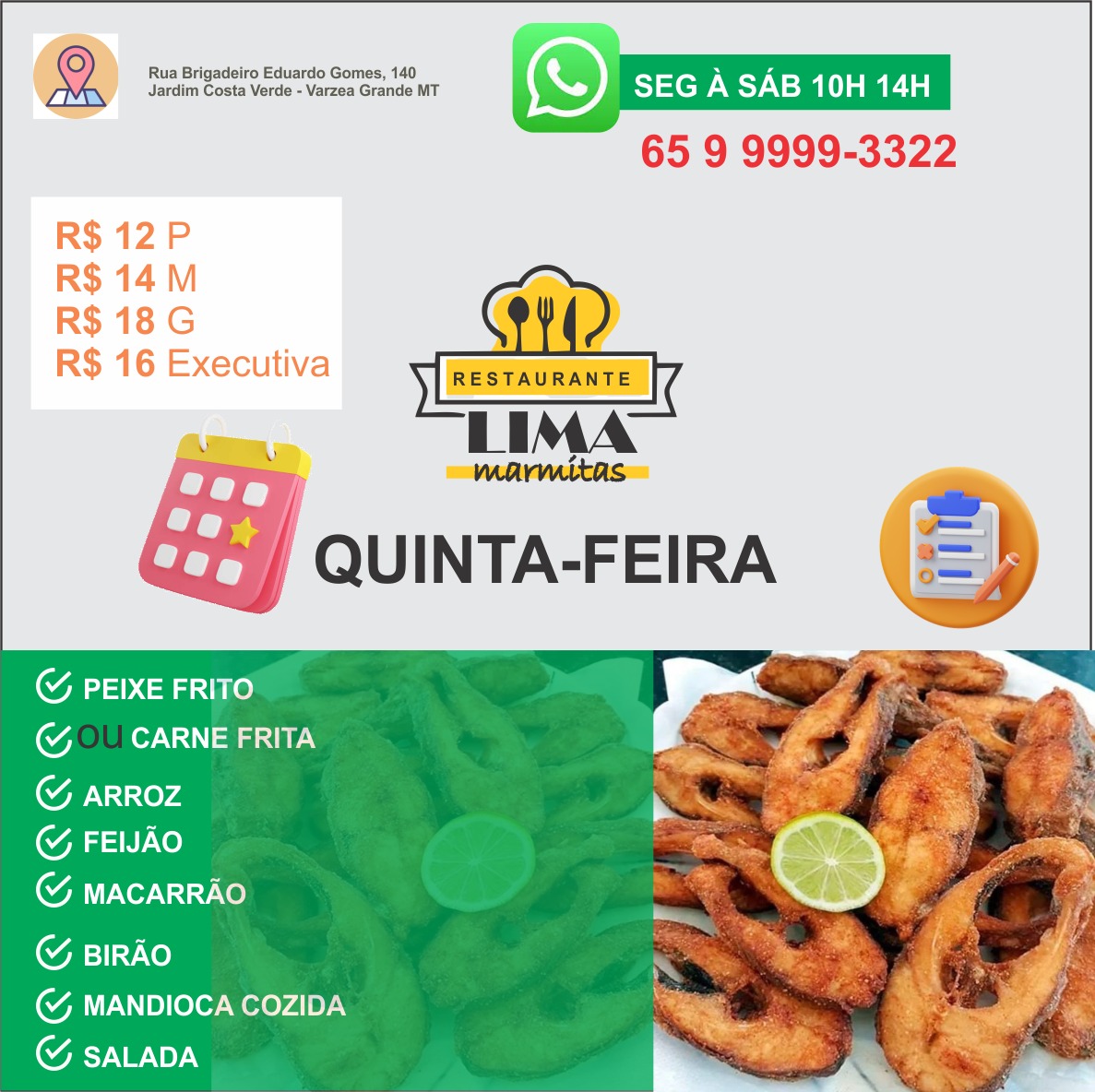 Texto na Publicidade: Peixe frito ou Carne frita / Arroz / Feijão / Macarrão / Birão / Mandioca Cozida / Salada