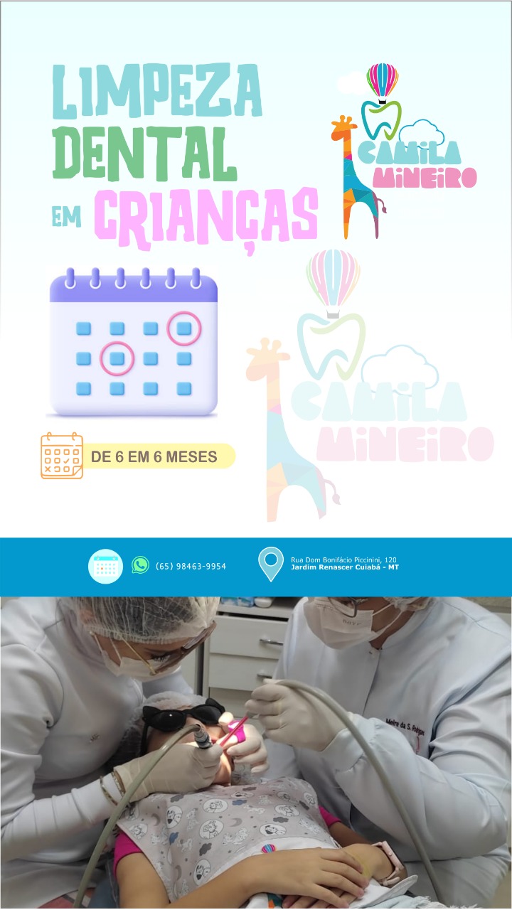 Cartaz Limpeza Dental de Crianças para Clínica Odontopediatra Dentista Tipo: Propaganda Redes SociaisSegmento: OdontopediatraCliente: Camila MineiroCores: Azul e RosaTexto na Publicidade: Limpeza Dental em Crianças