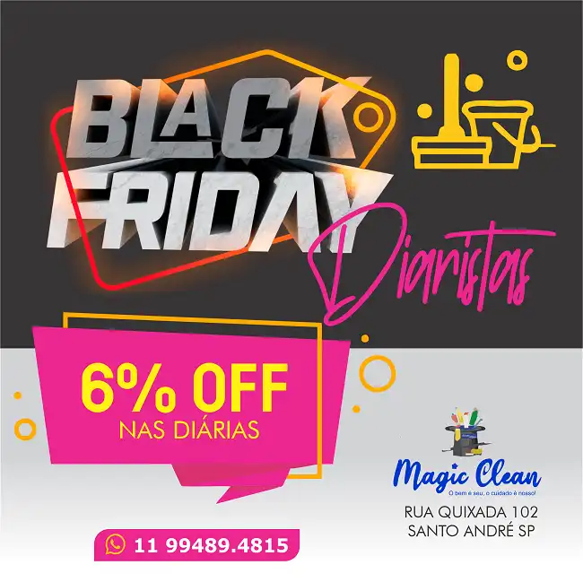Propaganda Black Friday Diaristas Tipo: Propaganda para Rede Social Segmento: Limpeza, Faxina Tema: Black Friday Diaristas Cores: Rosa e Amarelo Cliente: Magic Clean Serviços de Limpeza e Diaristas Promoção de Black Friday para Diaristas de Limpeza, descontão na diária.