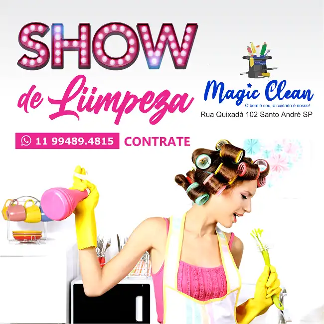 Propaganda criativa sobre Faxina Tipo: Propaganda Rede Social Formato: Feed MÃdia: Instagram e Facebook Cliente: Magic Clean Serviços de Faxina Tema: Faxina Cores: Rosa e Amarelo Show de Limpeza, contrate nossas profissionais de faxina.