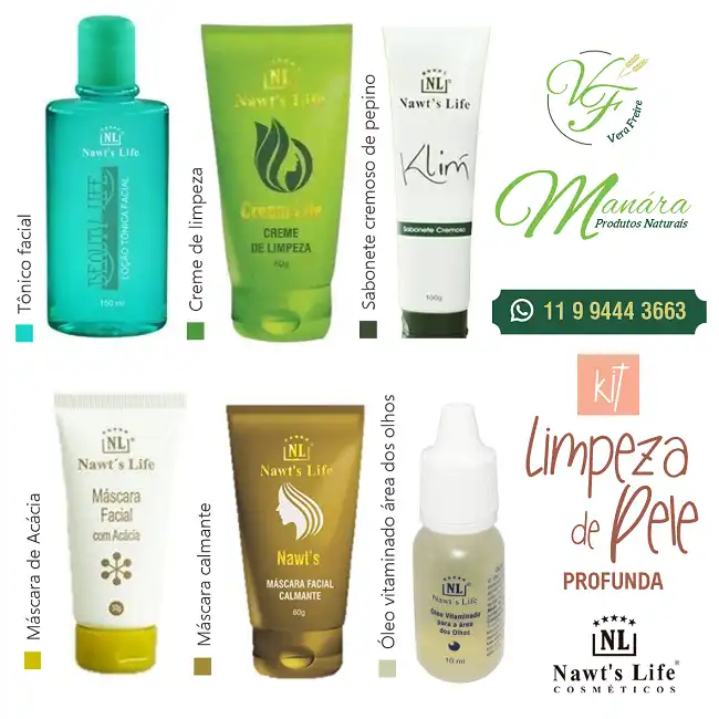 Mensagem: Tônico Facial; Creme de Limpeza; Sabonete cremoso de Pepino; Máscara de Acácia; Máscara Calmante; Óleo Vitaminado para área dos olhos.