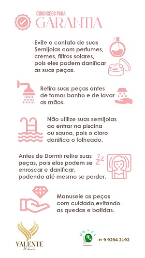 Folheto Garantia de Semijoias e Folheados Tipo: FolhetoCliente: Valente FolheadosCores: Rosa e DouradoLayout para Termos e Condições de Garantia de Semijoias e Folheados