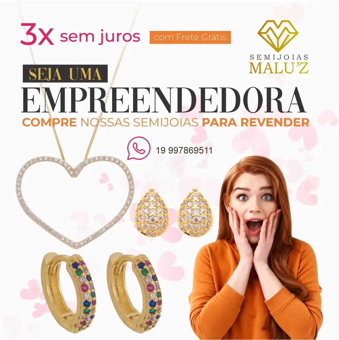 Propaganda Post Empreendedora de Semijoias Tipo: Propaganda para Rede SocialCliente: Malu’z SemijóiasTema: EmpreendedoraCores: Rosa, laranja e pretoMensagem: Seja uma empreendedora compre nossas semijóias para revender.