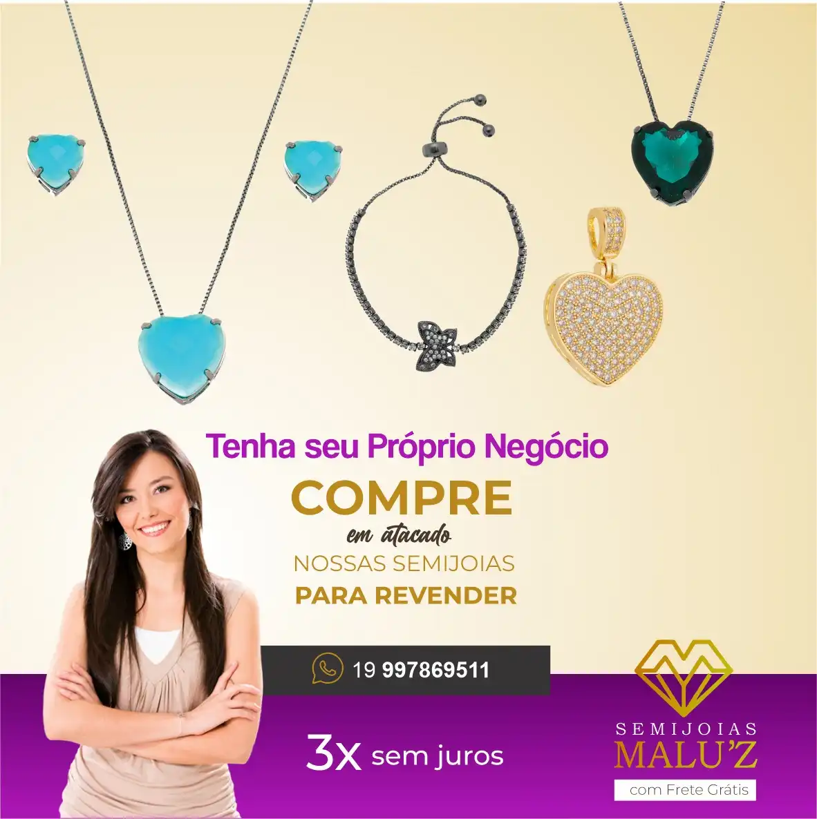 Propaganda Post Semeijoia em Atacado Tipo: Propaganda para Rede SocialCliente: Semijoias Malu’zTema: SemijóiaCores: Rosa e amareloMensagem: Tenha seu próprio negócio compre em atacado, nossas semijóias para revender.