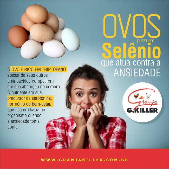 Mensagem: O ovo é rico em triptofano, apesar de seus outros aminoácidos de competirem em sua absorção no cérebro. O nutriente em si é precursor da seratonina, hormônio do bem-estar, que fica em baixa no organismo quando a ansiedade toma conta.