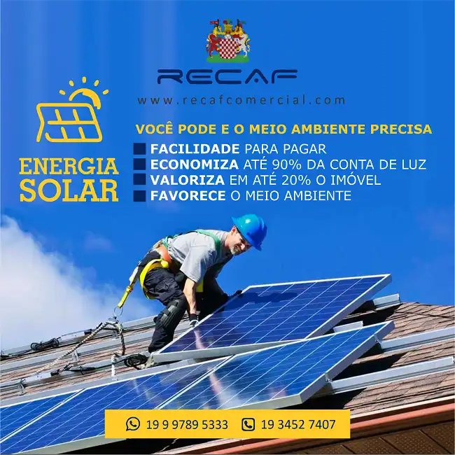 Mensagem: Energia Solar. Você pode e o meio ambiente precisa. Facilidade para pagar; Economize até 90% da conta de luz; Valoriza em até 20% o imóvel; Favorece o meio ambiente. Saiba mais: http://www.recafcomercial.com/energia