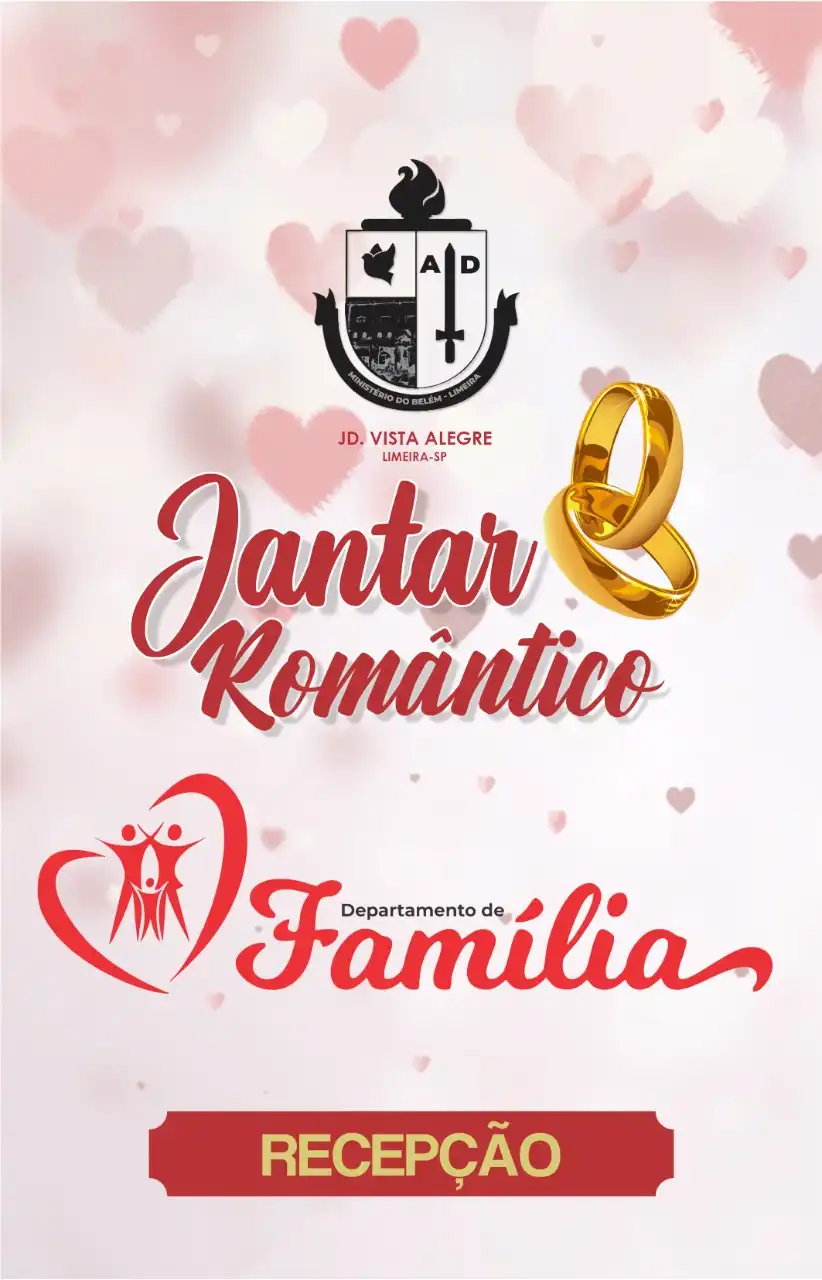 Folheto Cracha para Jantar Romântico Departamento de Família Igreja Tipo: FolhetoCliente: AD – Jd. Vistal Alegre – Limeira/SPTema: Cracha para jantarCores: Vermelho, rosa e amarloMensagem: Jantar Romântico Departamento de Família Recepção