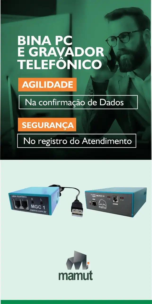 Folheto sobre Bina PC e Gravador Telefônico Tipo: FolhetoCliente: MamutTema: Bina PC e gravador telefônicoCores: Verde, laranja e azulMensagem: Bina PC e gravador telefônico Agilidade na confirmação de dadosSegurança no registro do atendimento