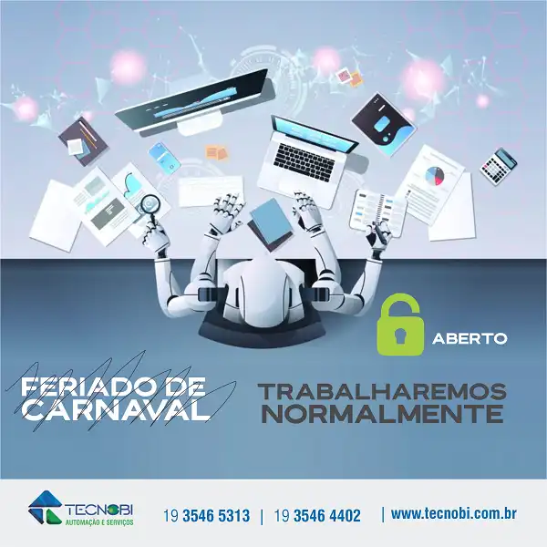 Propaganda sobre Trabalho em Empresa de Tecnologia e Automação Industrial Tipo: Propaganda para Rede Social Segmento: Tecnologia, Automação, Indústria, Automação Industrial Cores: Azul, Branco e Verde Estilo: Tech Cliente: Tecnobi Automação Industrial Frase: Aberto trabalhando normalmente