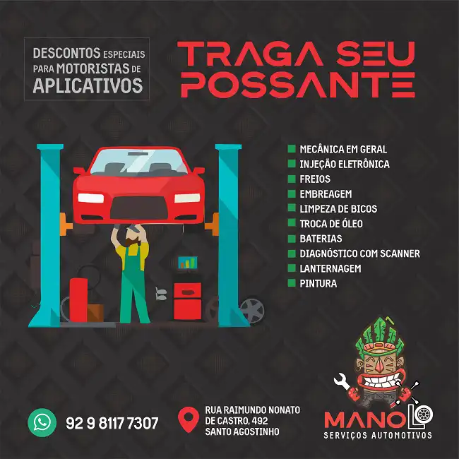 Propaganda Serviços Profissionais de Mecânica Automotiva Tipo: Propaganda Rede Social Segmento: Oficina Mecânica, Mecânico, Centro Automotivo Cores: Vermelho e Azul Tema: Serviços Profissionais de Mecânica Automotiva Cliente: Manolo Serviços Automotivos Mensagem: Traga seu possante. Serviços Profissionais de Mecânica Automotiva: Mecânica em geral; Injeção eletrônica; Freios; Embreagem; Limpeza de bicos; Troca de óleo; Baterias; Diagnóstico com … Ler mais Propaganda Serviços Profissionais de Mecânica Automotiva