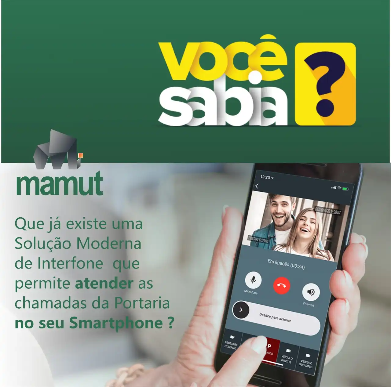 Propaganda Post Integração Interfone com Smartfone Celular Tipo: Propaganda para Rede SocialCliente: Mamut Tema: InterfoneCores: Verde, amarelo e brancoMensagem: Você sabia? Que já existe uma solução moderna de interfone que permite atender as chamadas de portaria no seu smartfone?