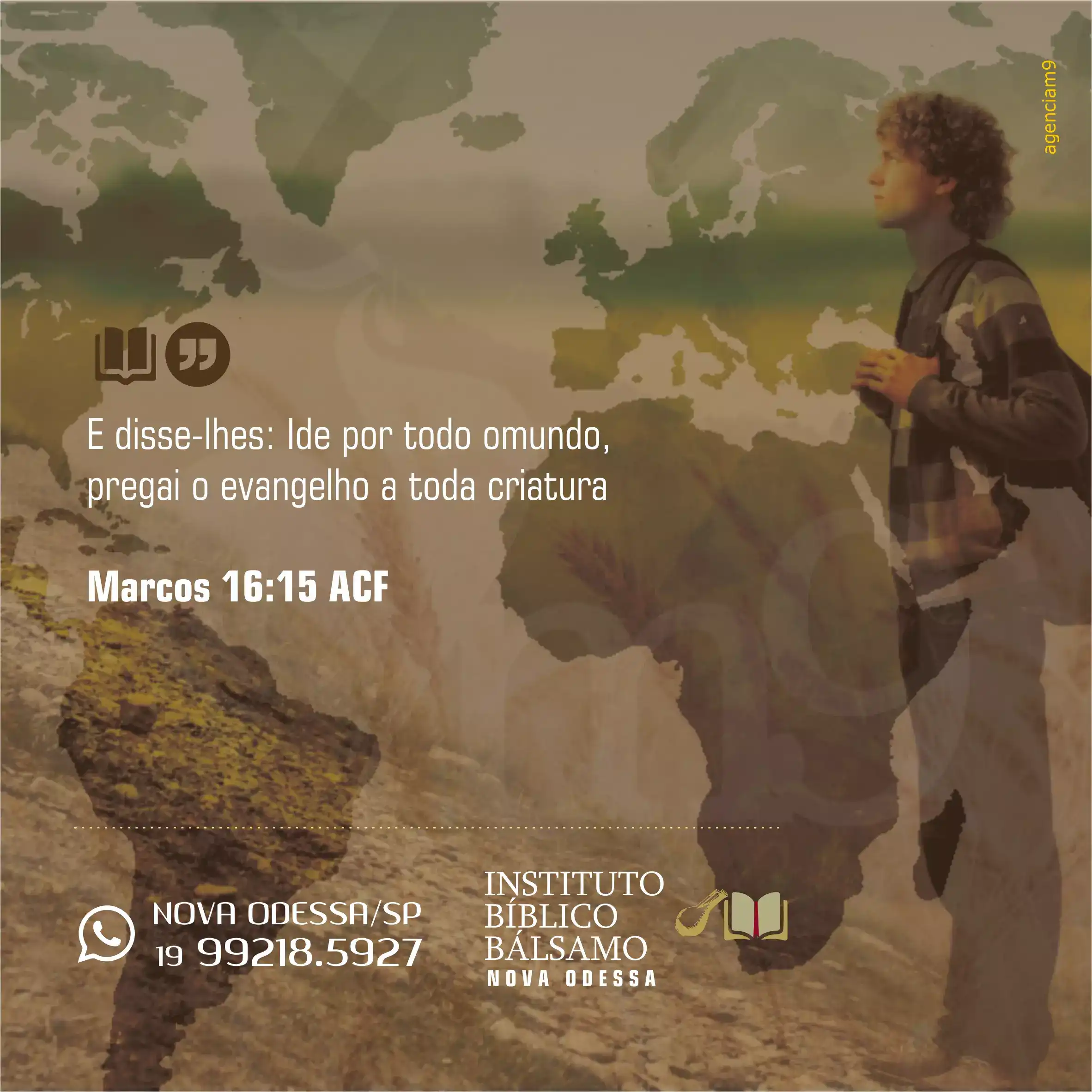 Propaganda sobre Missões Igreja Tipo: Propaganda para InstagramSegmento: ReligiãoTema: Missões IgrejaCliente: Instituto Bíblico Bálsamo Nova OdessaCores: Amarelo, azul e branco.Mensagem: E dizei-lhes: Ide por todo o mundo, pregai o evangelho a toda criatura. Marcos 16:15 ACF