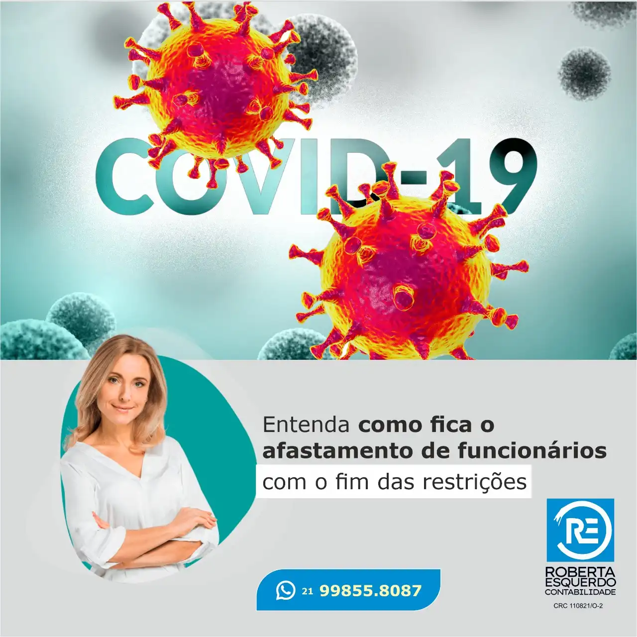 Propaganda Afastamento de funcionário COVID sem restrição Tipo: Propaganda para Rede SocialCliente: Roberta Esquerdo ContabilidadeTema: Afastamento por COVIDCores: Azul e brancoMensagem: Entenda como fica o afastamento de funcionários com o fim das restrições