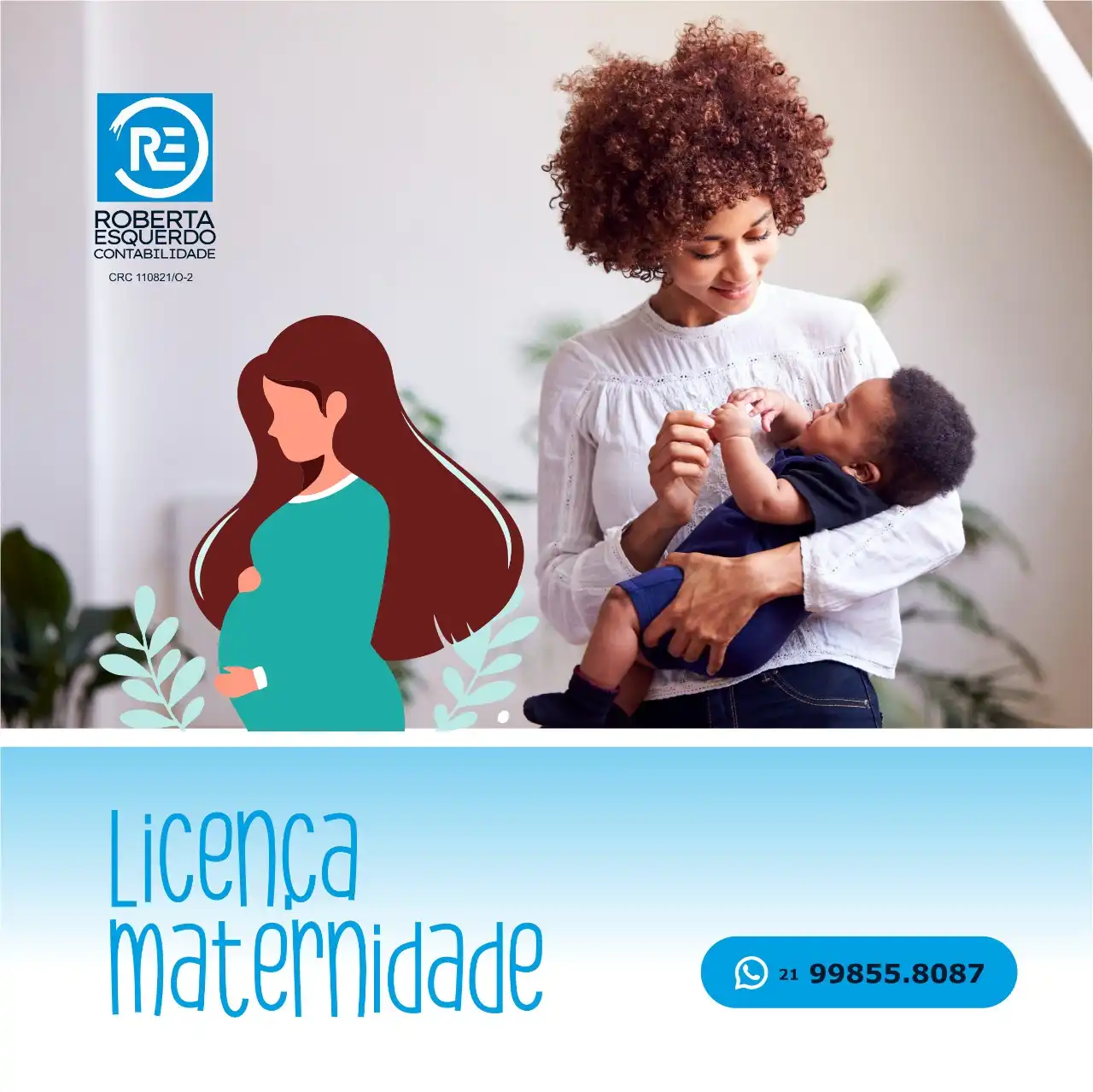 Propaganda Post Licença Maternidade Escritório de Contabilidade Tipo: Propaganda para Rede SocialCliente: Roberta Esquerdo ContabilidadeTema: Licença maternidadeCores: Azul e brancoMensagem: Direitos da licença maternidade