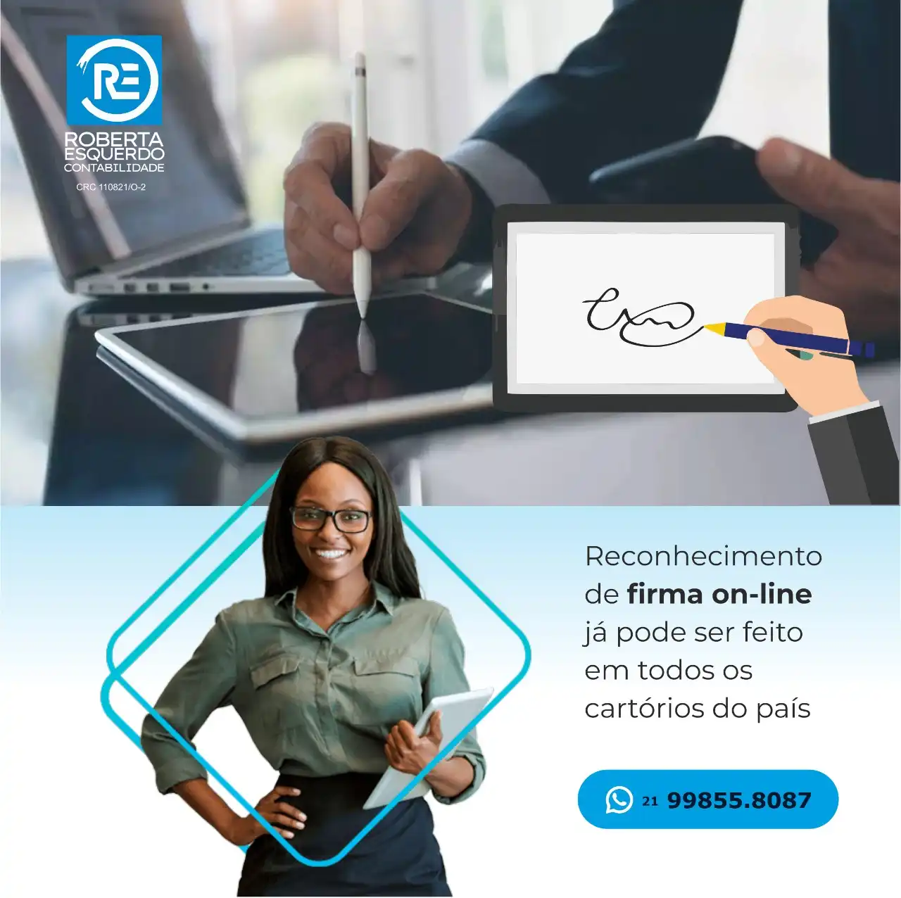 Propaganda Post Reconhecimento de Firma Online Escritório de Contabilidade Tipo: Propaganda para Rede SocialCliente: Roberta Esquerdo ContabilidadeTema: Reconhecimento de firmaCores: Azul e brancoMensagem: Reconhecimento de firma on-line já pode ser feito em todos os cartórios do país.