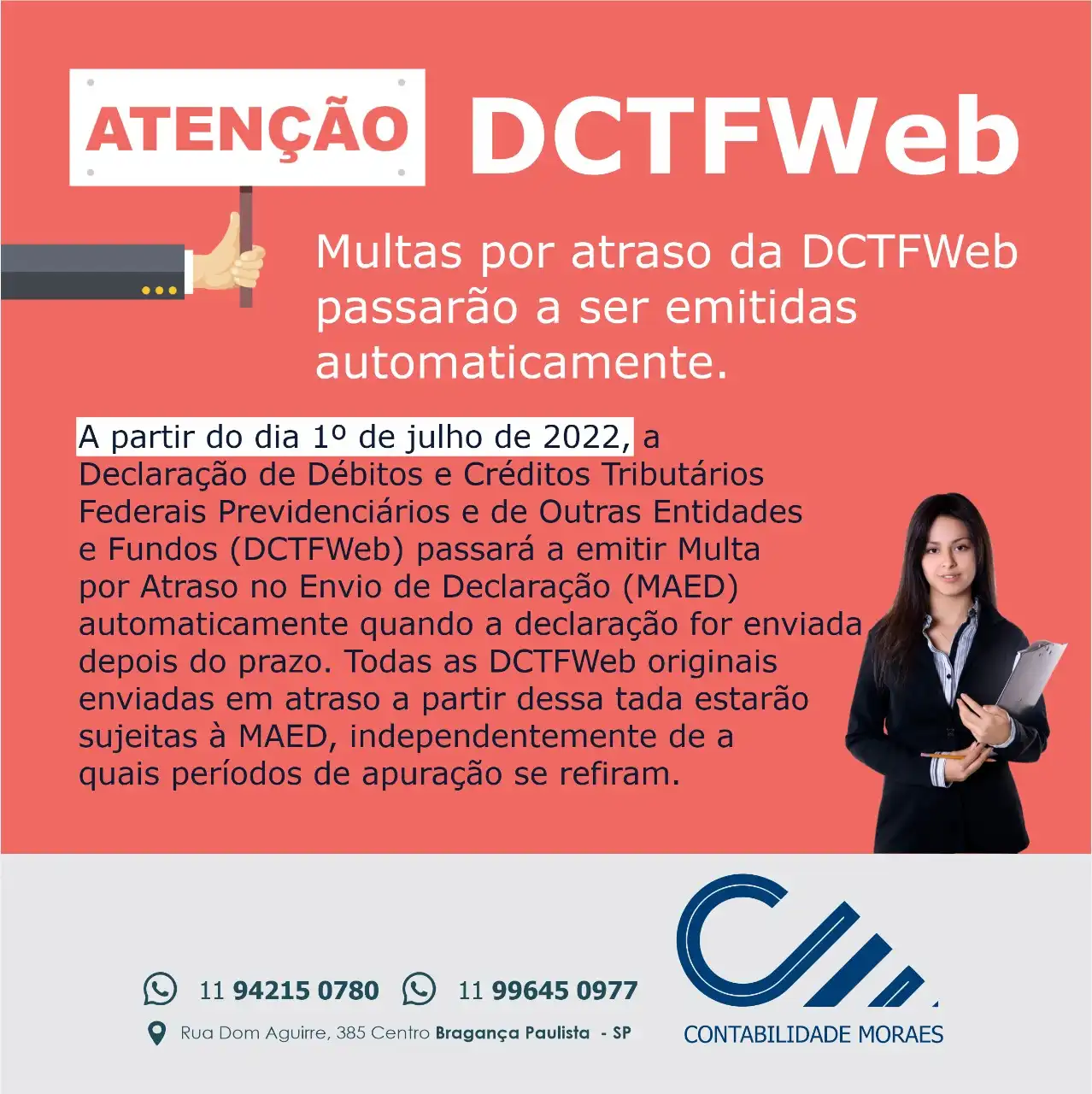 Propaganda Post sobre DCTFWeb para Escritório de Contabilidade Tipo: Propaganda para Rede SocialCliente: Contabilidade MoraesTema: DCTFWebCores: Rosa, branco e azulMensagem: Atenção: DCTFWeb Multas por atraso da DCTFWeb passarão a ser emitidas automaticamente.A partir de 1º de Julho de 2022, a declaração de débitos e créditos tributários federais e previdenciários e de outras entidades e fundos … Ler mais Propaganda Post sobre DCTFWeb para Escritório de Contabilidade