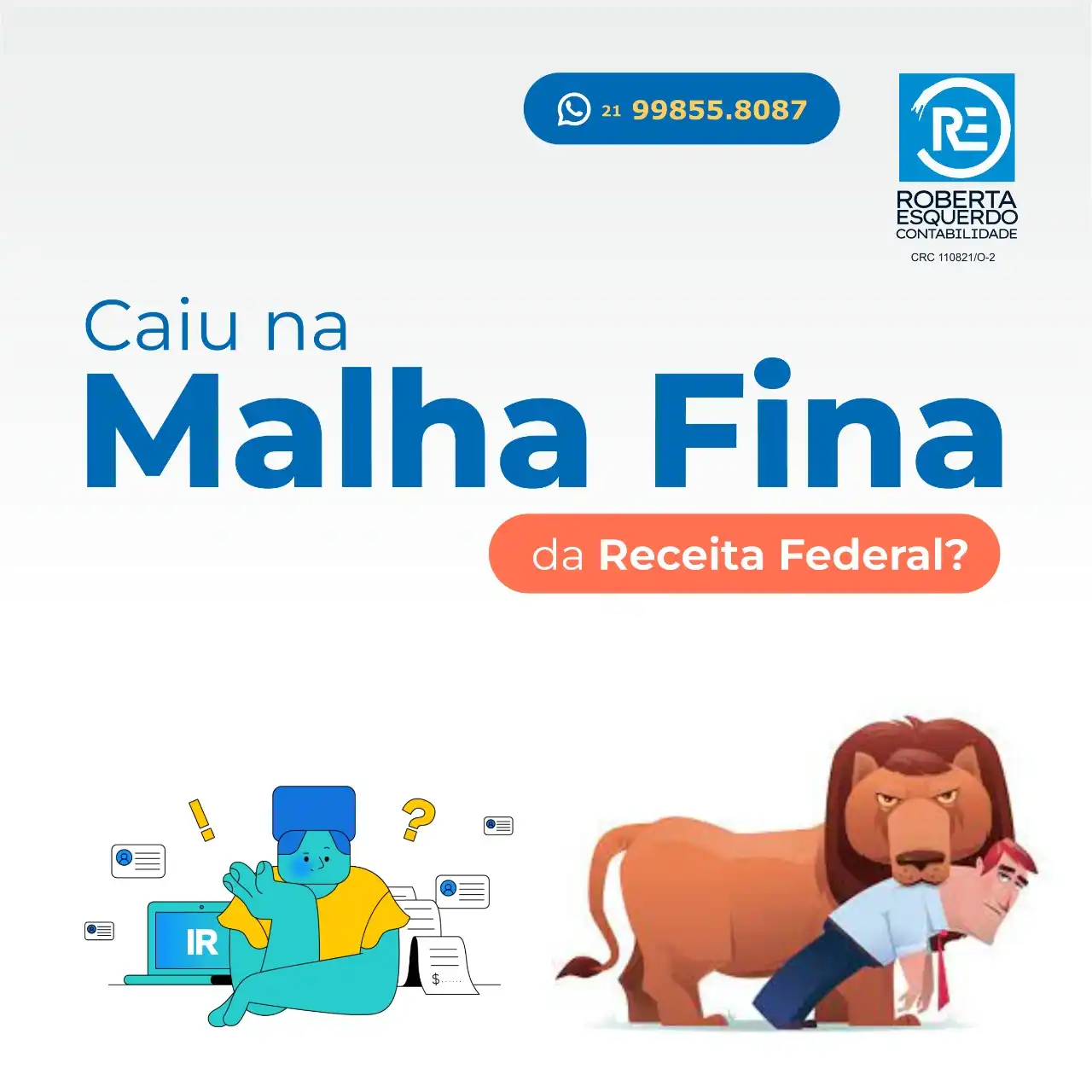 Propaganda Post sobre Malha Fina para Escritório de Contabilidade Tipo: Propaganda para Rede SocialCliente: Roberta Esquerdo ContabilidadeTema: Malha finaCores: Azul, branco e laranjaMensagem: Caiu na malha fina da Receita Federal?