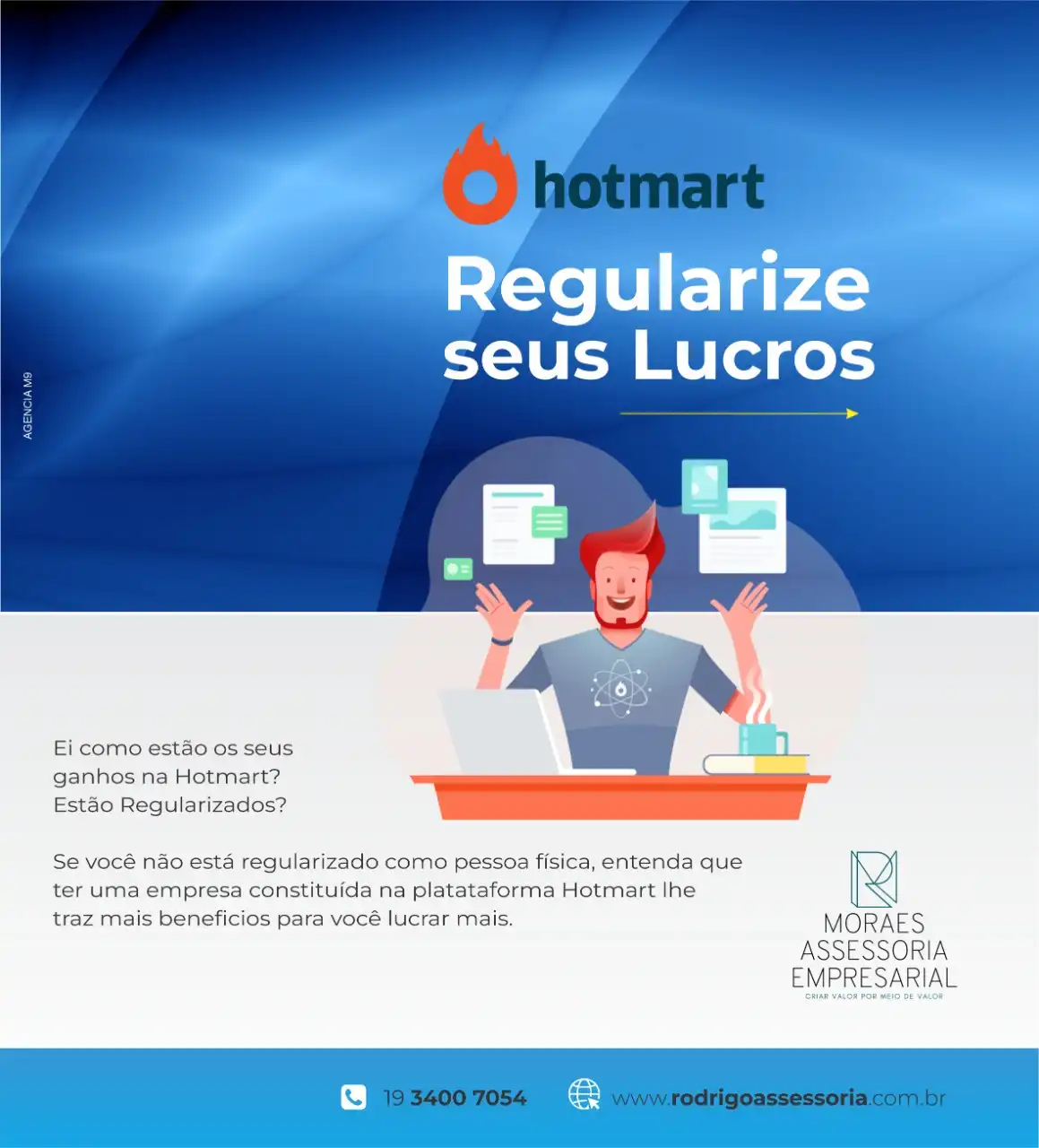 Propaganda Post sobre Regularização de Lucros Hotmart para Escritório de Contabilidade Tipo: Propaganda para Rede SocialCliente: Moraes Assessoria EmpresarialTema: Regularização de lucrosCores: Azul e brancoMensagem: Regularize seus lucros Ei como estão os seus ganhos na Hotmart? Estão regularizados?Se você não está regularizado como pessoa física, entenda que ter uma empresa constituída na plataforma Hotmart lhe … Ler mais Propaganda Post sobre Regularização de Lucros Hotmart para Escritório de Contabilidade