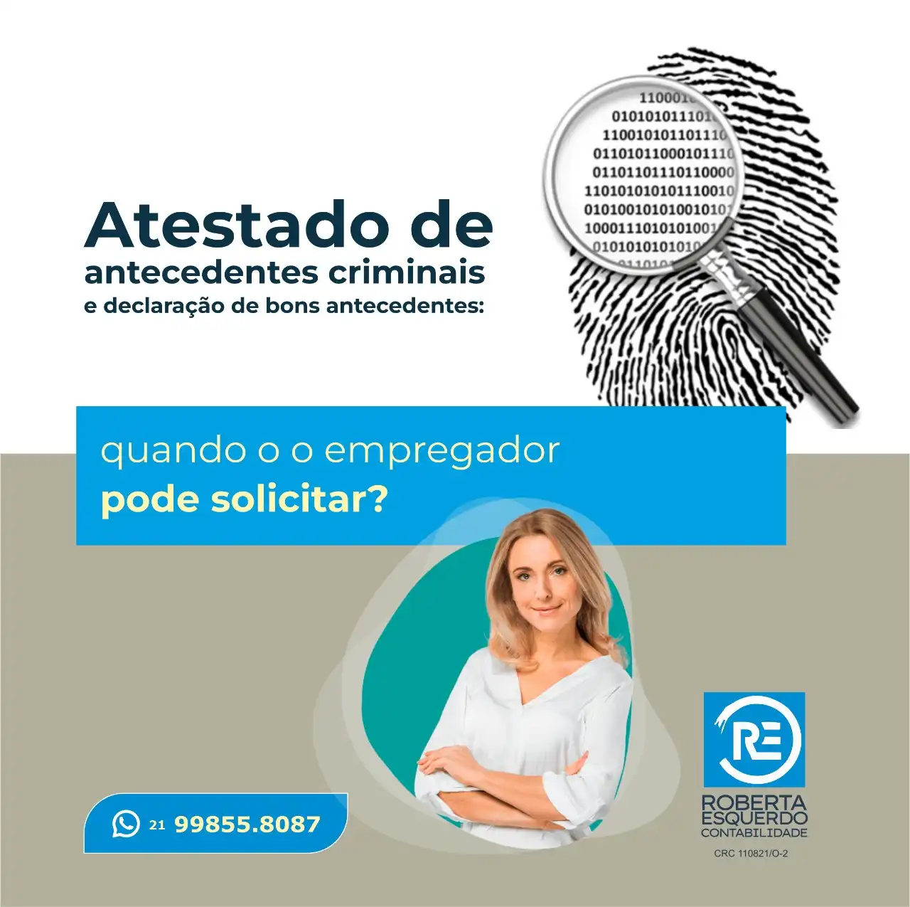 Propaganda atestado de antecente criminal e setor de recursos humanos contabilidade Tipo: Propaganda para Rede SocialCliente: Roberta Esquerdo ContabilidadeTema: Azul e brancoMensagem: Atestado de antecedentes criminais e declaração de bons antecedentes: quando o empregador pode solicitar?
