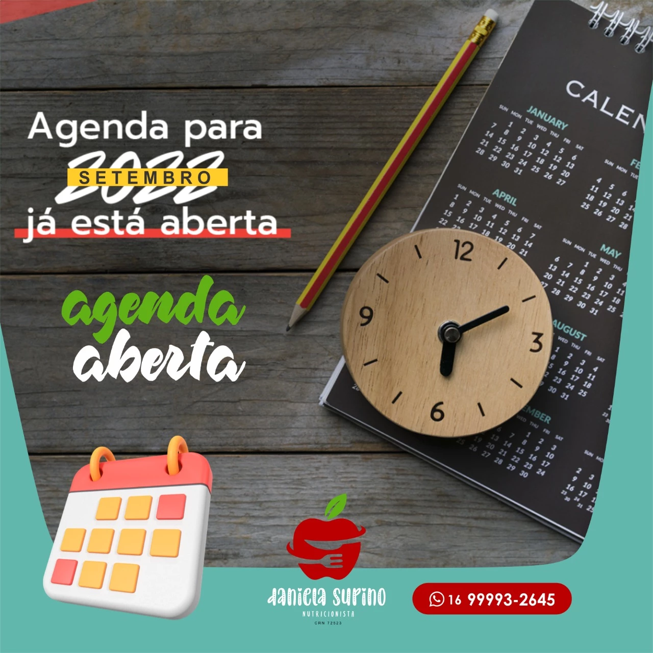 Propaganda Agenda Aberta Nutricionista Nutrição Tipo: Propaganda Rede Sociais Segmento: NutriçãoCliente: Daniela Supino Cores: Verde e VermelhoTexto na Publicidade: Agenda para Setembro já está aberta