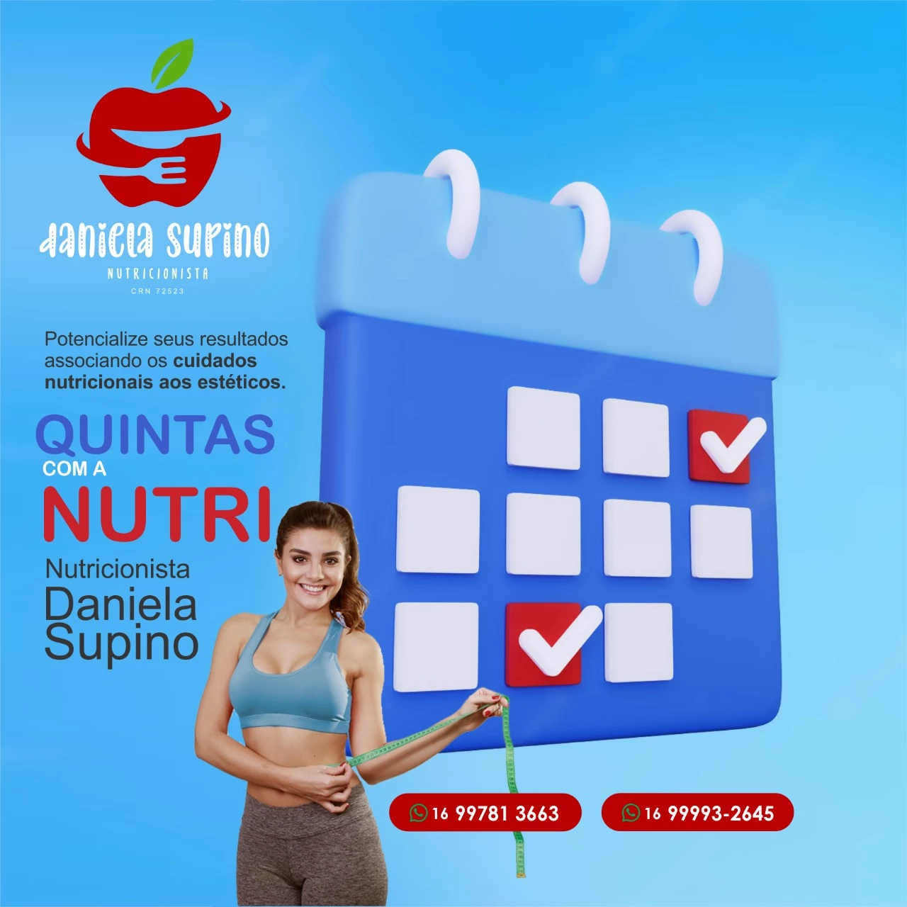 Propaganda Nutrição com foco Estética do Corpo Tipo: Propaganda Redes SociaisSegmento: NutriçãoCliente: Daniela SupinoCores: Azul e VermelhoTexto na Publicidade: Potencialize seus resultados associando os cuidados nutricionais aos estéticos. Quinta com a Nutricionista Daniel Supino.