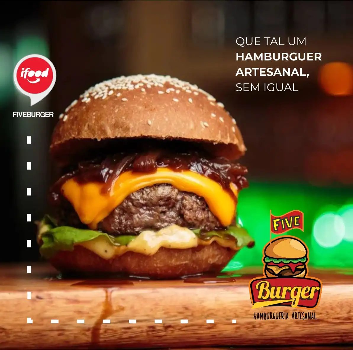 Propaganda Post Hamburguer Artesanal Sabor sem Igual Tipo: Propaganda para Rede SocialCliente: Five BurguerTema: Hamburguer artesanalCores: Vermelho, amarelo e verdeMensagem: Que tal um hamburguer artesanal sem igual.