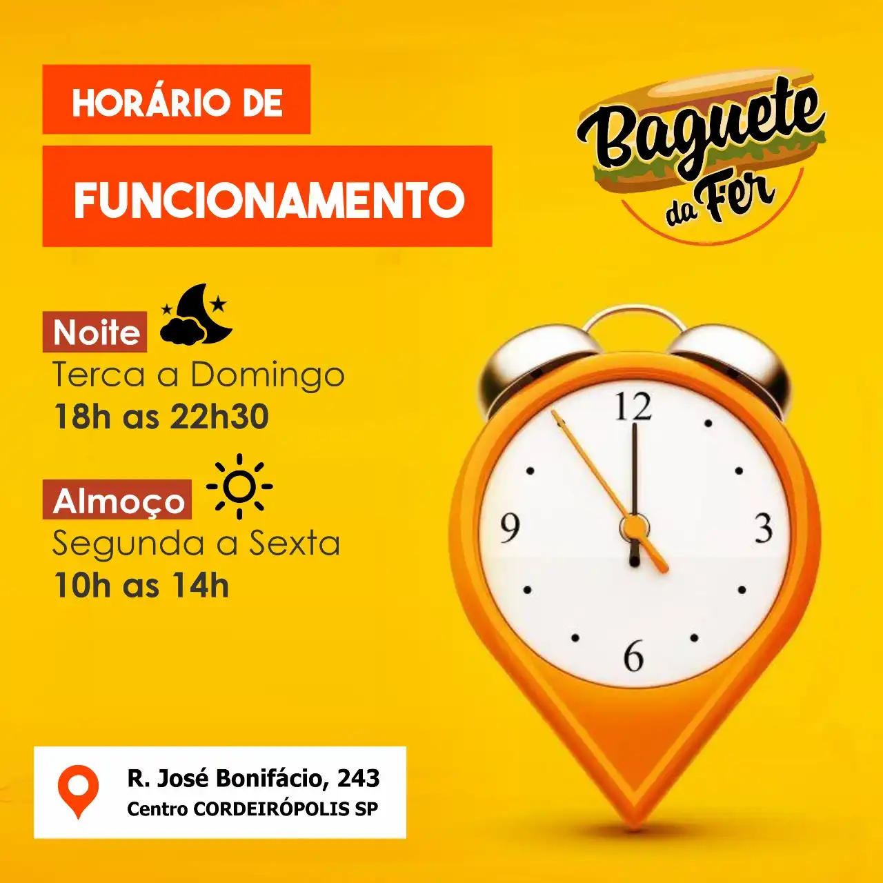 Propaganda Post Horário de Funcionamento Lanchonete Tipo: Propaganda para Rede SocialCliente: Baguete da FerTema: Horário de funcionamentoCores: Amarelo, vermelho e laranjaMensagem: Horário de funcionamento Noite: Terça a Domingo 18h as 22h30Almoço: Segunda a Sexta 10h as 14 h R. José Bonifácio, 243Centro, Cordeiropolis/SP