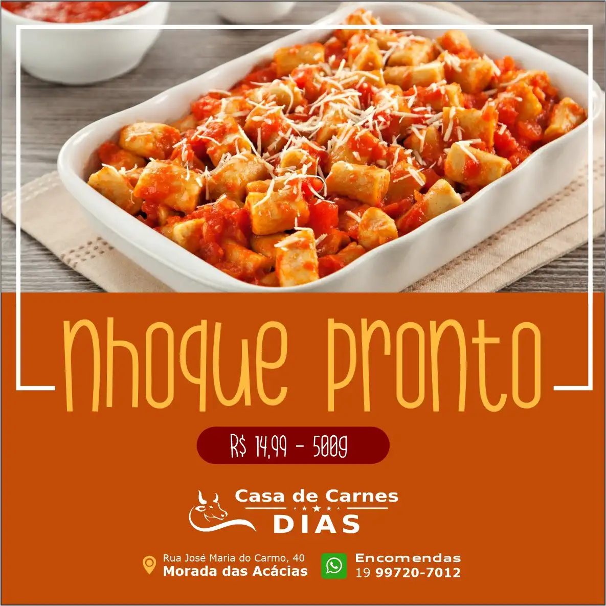 Propaganda Post Nhoque Pronto Tipo: Propaganda para Rede SocialCliente: Casa de Carnes DiasTema: NhoqueCores: Laranja, amarelo e vermelhoMensagem: Nhoque pronto R$ 14,99 – 500 gramas